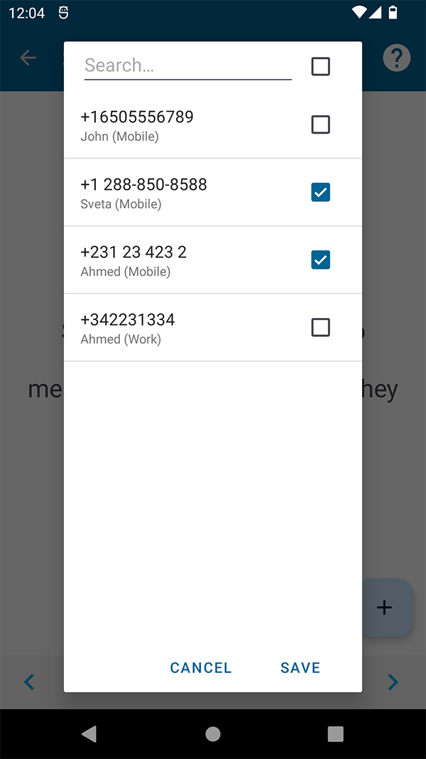 Se concedi l'autorizzazione a leggere i contatti, l'applicazione analizzerà la tua rubrica per un breve periodo e li aggiungerà all'applicazione. Qui puoi selezionare contatti o gruppi di contatti per i quali verrà applicato il filtro: