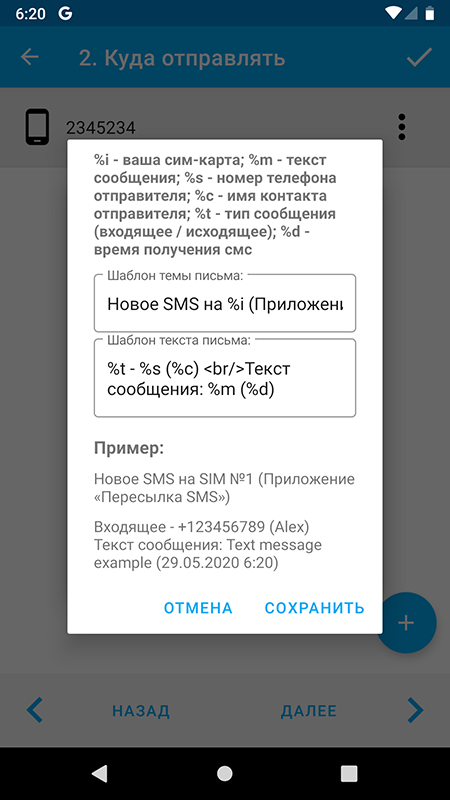 - %i - ваша сим карта (уникальный идентификатор, если у вас больше 1 сим карты, можно указать в настройках приложения);